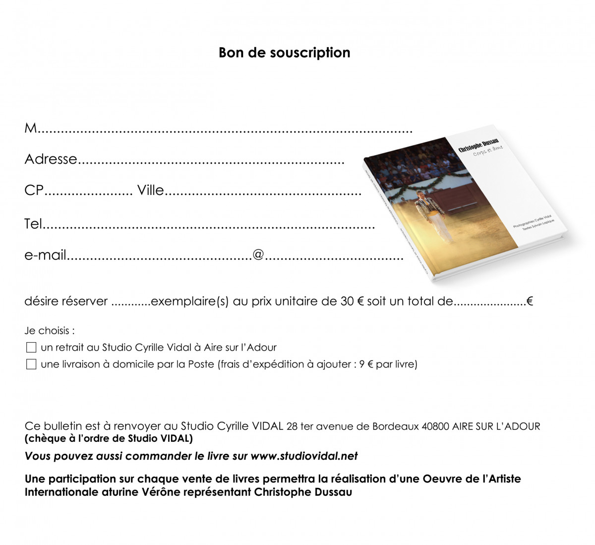 Vous pouvez soit passer au studio, soit nous renvoyer un bon de souscription, soit le commander ICI en ligne.