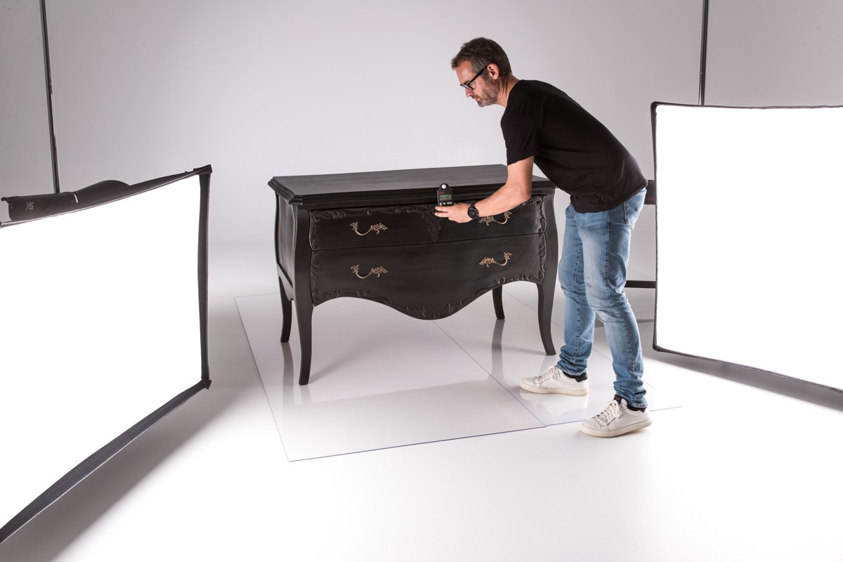 J’ai éclairé le fond blanc avec deux flashs munis d’un bol asymétrique. J’ai placé la commode noire sur une grande plaque de plexi brillante afin que le fond blanc se reflète sur la plaque. J’ai éclairé la commode avec deux flashs, boîtes à lumière de 80x100, placés à gauche et à droite, parallèlement aux côtés du meuble. J’ai placé au-dessus du meuble, sur toute sa largeur, un fond gris neutre que j’ai baissé jusqu’à obtenir le bon compromis d’éclairage pour à la fois avoir du détail et un plateau suffisamment foncé. J’ai placé à gauche du meuble sur la hauteur un panneau noir pour également maîtriser le retour de lumière que je souhaitais.